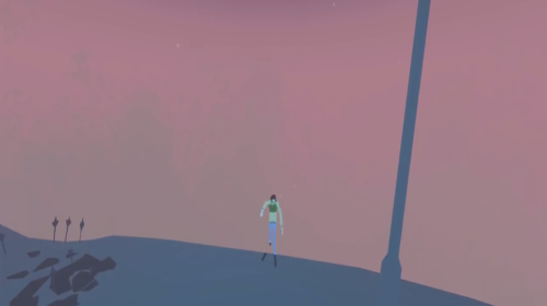 2、第二个场景切换为粉紫色调的开阔地形,角色向远处行进,周围可见类似标识物的物体,营造出探索类游戏的氛围。