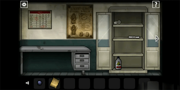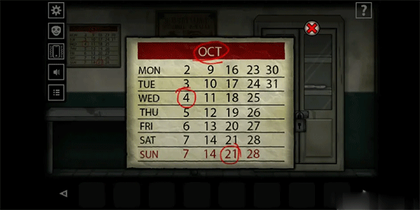 醒来后出门到第四个房间(医务室),观察墙上的日历(OCT是十月英文的缩写)获得密码「10421」,接着输入密码打开下面的抽屉获得「一串钥匙」。