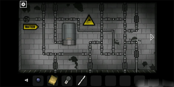 退出房间再来到工具房门口,根据水池里的提示打开铁门。进入房间后连接水管,再点击左上角的阀门。